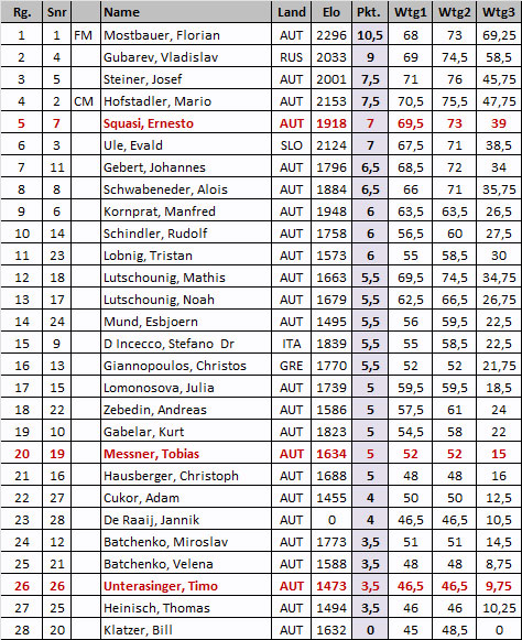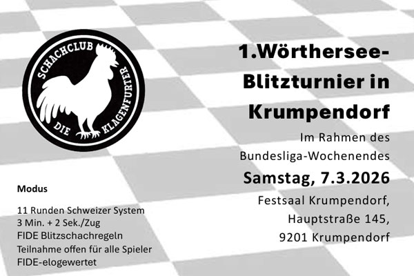 Im Rahmen des Spielwochenendes der 2. Bundesliga Mitte in Krumpendorf am Wörthersee wurde gestern Samstag ein 11-rundiges Blitzturnier (3 min +2) durchgeführt. Drei Lienzer  Nachwuchsspieler ließen sich nicht lumpen und nahmen spontan an diesem Bewerb teil: Ernesto Squasi, Tobias Messner und Timo Unterasinger. Das (Gesamt-)Ergebnis ist ziemlich ausgeglichen: Ernesto Squasi verbesserte seinen Startrang um 2 Plätze, Tobias Messner verlor 1 Rang gegenüber der Ausgangsposition und bei Timo Unterasinger sind Start- und Endrang identisch. Höchst erfreulich ist aber die spontane und eigenständige Entscheidung zur Teilnahme an dieser Veranstaltung!
