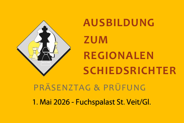 Der Kärntner Schachverband lädt alle an den Schachregeln Interessierten – ungeachtet jeglicher Spielstärke oder Erfahrung im Schach – zu einem Regionalen Schiedsrichter-Kurs am FR, 1. Mai 2026, im Fuchspalast St. Veit/Glan ein. Kiebitzen ist das kostenlose Beiwohnen gestattet.
