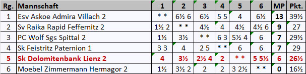 Das Meisterschaftsspiel in der Bezirksliga West gegen Hermagor war eine klare Angelegenheit für die Dolomitenstädter. Schon die Aufstellung zeigte, dass wir auch elomäßig auf fast allen Brettern stärker besetzt waren, das sich schlussendlich auch im Ergebnis widerspiegelt. Die Stammspieler dieses Teams blieben alle erfolgreich, Alfred Bodner einigte sich mit Andreas Bergmann (ein blinder Spieler) auf ein Unentschieden. In der Tabelle näherte sich die Mannschaft an das Mittelfeld heran!