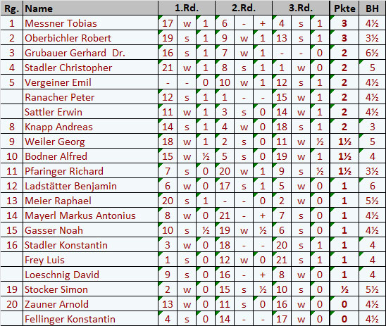 Nach der 3. Runde sind noch 2 Spieler mit einer weißen Weste. Darüber hinaus wechselte auch die Tabellenführung von Robert Oberbichler zu Tobias Messner. Beide gewannen heute ihre Partien, Tobias siegte gegen Stadler Christopher und Robert besiegte seinen Teamkollegen Raphael Meier. Georg Weiler lag mit einer Leichtfigur im Vorteil, vergab aber in der Schlussphase den möglichen Punkt und musste sich mit einem Unentschieden abfinden. Erfolgreich beendete Alfred Bodner und Peter Ranacher seine Partie und Arnold Zauner läuft nach wie vor dem ersten Sieg nach. In der kommenden Runde kommt es zum Duell der beiden Führenden, eine weiteres Lienzer Duell ergibt sich bei der Paarung Weiler Georg gegen Erwin Sattler.