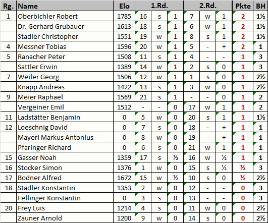 Die 2. Runde der laufenden Bezirksmeisterschaft lief nicht gut für die Lienzer Teilnehmer. Alle mussten eine Niederlage zur Kenntnis nehmen, ausgenommen Dr. Gerhard Grubauer, der das interne Duell gegen Erwin Sattler für sich entscheiden konnte. Drei Partien mussten krankheitsbedingt kontumaziert werden. Von den Ergebnissen sticht die Niederlage von Alfred Bodner gegen Emil Vergeiner hervor, Arnold Zauner ist immer noch auf der Jagd nach dem ersten vollen Punktegewinn. Vier Spieler weisen in der Tabelle zwei Punkte auf, Dr. Gerhard Grubauer wird urlaubsbedingt in den nächsten beiden Runden nicht ausgelost. Runde 3 findet am kommenden Freitag (30.1.) statt.