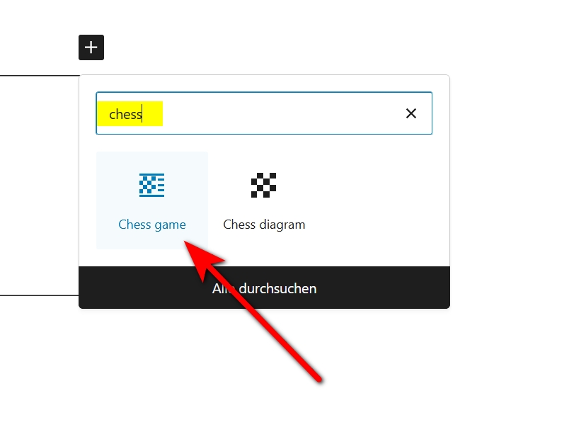 Einfach entweder Chess in die Suchmaske schreiben und dann Chess game aussuchen, oder ‚Alle durchsuchen‘ und dann das PGN Chessboard auswählen. Dann das hochgeladene PGN File mit PGN file aussuchen.