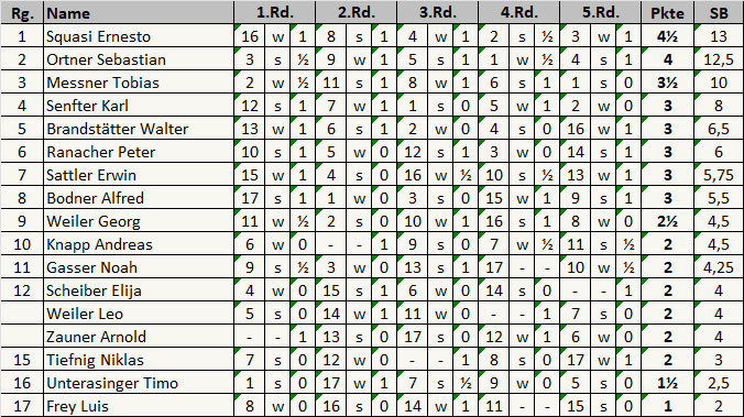 Mit der 5. Runde wurde die Halbzeit des Turniers überschritten.  Die ersten drei in der Tabelle blieben unverändert, es folgt dann ein großer Block mit 3 bzw. 2 Punkten. Hier werden erst die kommenden Runde eine Differenzierung bringen.