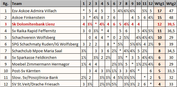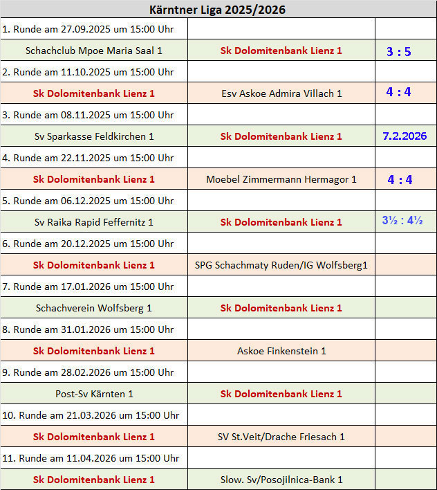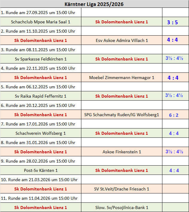 Der Schachklub Dolomitenbank Lienz nimmt mit einer Mannschaft an der Meisterschaft der Kärntner Landesliga 2025/26 teil.