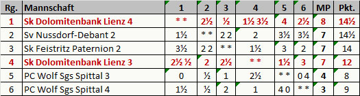 Mit der heutigen 6. Runde begann die Rückrunde in der 2. Klasse West. Dabei tragen die beiden Dolomitenbank-Teams aufeinander. Mit einem 3½:½-Sieg holte sich das Team Lienz 3 die Tabellenführung. Tobias Messner und Timo Unterasinger zeigten bereits in den letzten Wochen einen starken Leistungszuwachs, der durch den heutigen Sieg deutlich unterstrichen wurde. Zum Gesamtsieg steuerte auch Fridolin Geiger einen ganzen Zähler bei und mit der Punkteteilung von Steininger Valentin gegen Luis Frey stand der klare Sieg fest und als „Belohnung“ dafür dürfen sie von der Tabellenspitze lachen!