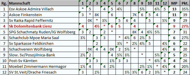 Die Ausgangsposition war wieder einmal prekär, zahlreiche Stammspieler mussten für diese Begegnung absagen, die Mannschaft trat mit letzter Reserve zum Meisterschaftsspiel nach Wolfsberg. Umso größer die Freude und Überraschung, dass wir ohne Niederlage die Heimreise antreten konnten. Zum Sieg fehlte nur wenig, Julian Maresic auf Brett 1 war lange Zeit ebenbürtig, ein Fehlzug kostete leider die Partie. Ernesto Squasi auf Brett 2 brachte im Endspiel seinen Bauern nicht aufs Umwandlungsfeld, mit Turm und Springer gegen Dame ergab sich die Punkteteilung. Weitere Punkteteilungen gab es bei Sebastian Ortner, Wurm Christof und Alfred Bodner. Für das erfreuliche Endergebnis sorgten auf den beiden letzten Brettern Dana Biasco und Peter Ranacher.