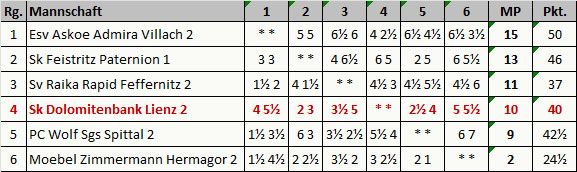 Die Meisterschaft 2025/26 in der Bezirksliga West wurde mit der heutigen Schlussrunde abgeschlossen. Die Mannschaft von Dolomitenbank Lienz 2 verlor gegen den Tabellennachbarn Feistritz-Paternion mit 5:3. Die beginnenden Osterferien erschwerten die Mannschaftsaufstellung, so dass nicht die stärkste Mannschaft gestellt werden konnte. Hervorzuheben ist aber der Sieg von Simon Lugger auf Brett 1 gegen Adrijan Rozic sowie auch der unentschiedene Spielausgang von Timo Unterasinger gegen Karl Binder. Timo lag bereits mehr als einen Turm im Rückstand, trotzdem gab er die Partie nicht verloren. Ständige Versuche auf einen Mattangriff störten die Pläne des Gegners, welcher dabei zweimal eine Fesselung übersah und Timo materiellen Ausgleich herstellen konnte. Trotz eines Mehrbauern bot Timo ein Remis an, welches der Gegner gerne annahm. Luis Frey bemühte sich sehr, er übersah allerdings das Schlagen eines ungedeckten Läufers. Eine solche Chance bot sich kein zweites Mal und musste schlussendlich die Partie verloren geben.