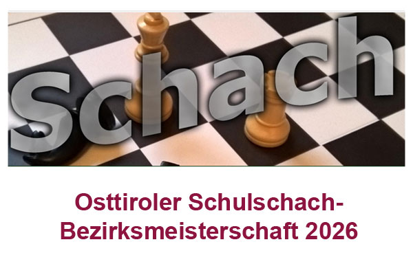 Am Mittwoch, 4. März 2026 findet im Gymnasium Lienz die Osttiroler Schulschach-Bezirksmeisterschaft statt. Es ist dies ein Mannschaftsturnier mit 4 Spielern je Mannschaft (+1 Ersatzspieler). Gespielt werden 7 Runden mit einer Bedenkzeit von 15 min pro Spieler und Partie. Das Turnier gilt als ideale Vorbereitung für die Schulschach-Landesmeisterschaft am 9. und 10. April 2026 in Innsbruck.