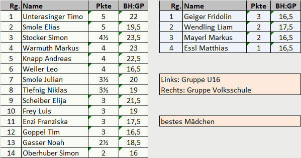 Beim 2. Bewerb im Rahmen des Karnischen Jugendcups holte sich der Schachklub Lienz den Sieg in beiden Katgorien. In der Gruppe der Unterstufenschüler holte sich Timo Unterassinger den Sieg vor dem punktegleichen Elias Smolle. Smon Stocker rangiert auf Platz drei mit einem halben Zähler Rückstand. Die Kategorie der Unterstufe entschied Fridolin Geiger für sich.