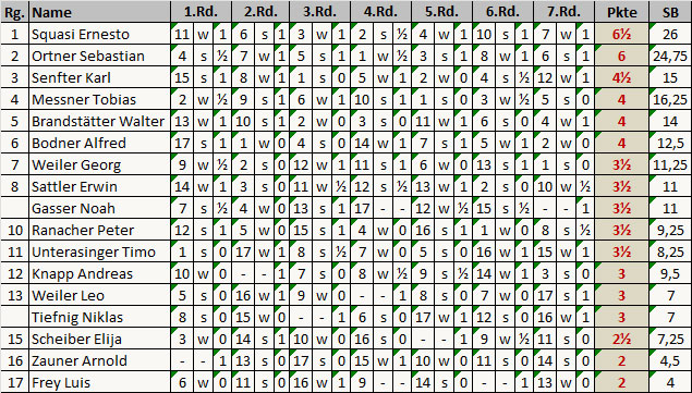 In der 7. Runde der laufenden Stadtmeisterschaft gab es zwar interessante und spannende Partien, am Schluss aber setzten sich doch die Favoriten durch. So gewann Sebastian Ortner gegen alfred Bodner und Ernesto Squasi gegen Georg Weiler. Walter Brandstätter bremste den Erfolgslauf von Tobias Messner und verdrängte ihn vom dritten Tabellenrang, den nun Karl Senfter nach einem Sieg gegen Andreas Knapp einnimmt. Eine Vorentscheidung ist damit gefallen, höchstens wenn in der nächsten Runde Walter Brandstätter dem Führenden noch einen (halben) Zähler abnehmen kann.